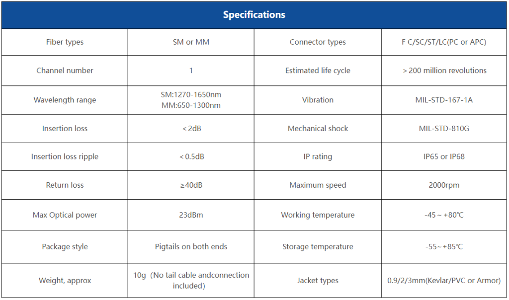 LPFO optical slip rings are also known as fiber optic rotary couplers, optical rotary couplers. Optical slip ring uses optical fiber as a carrier. It offers the best solution for high capacity data and signal transmission. Optical slip ring can be integrated with traditional electrical slip rings. The hybrid slip ring model is capable of transmitting power, signals and high-speed data.