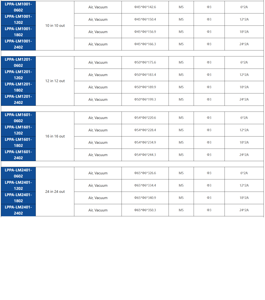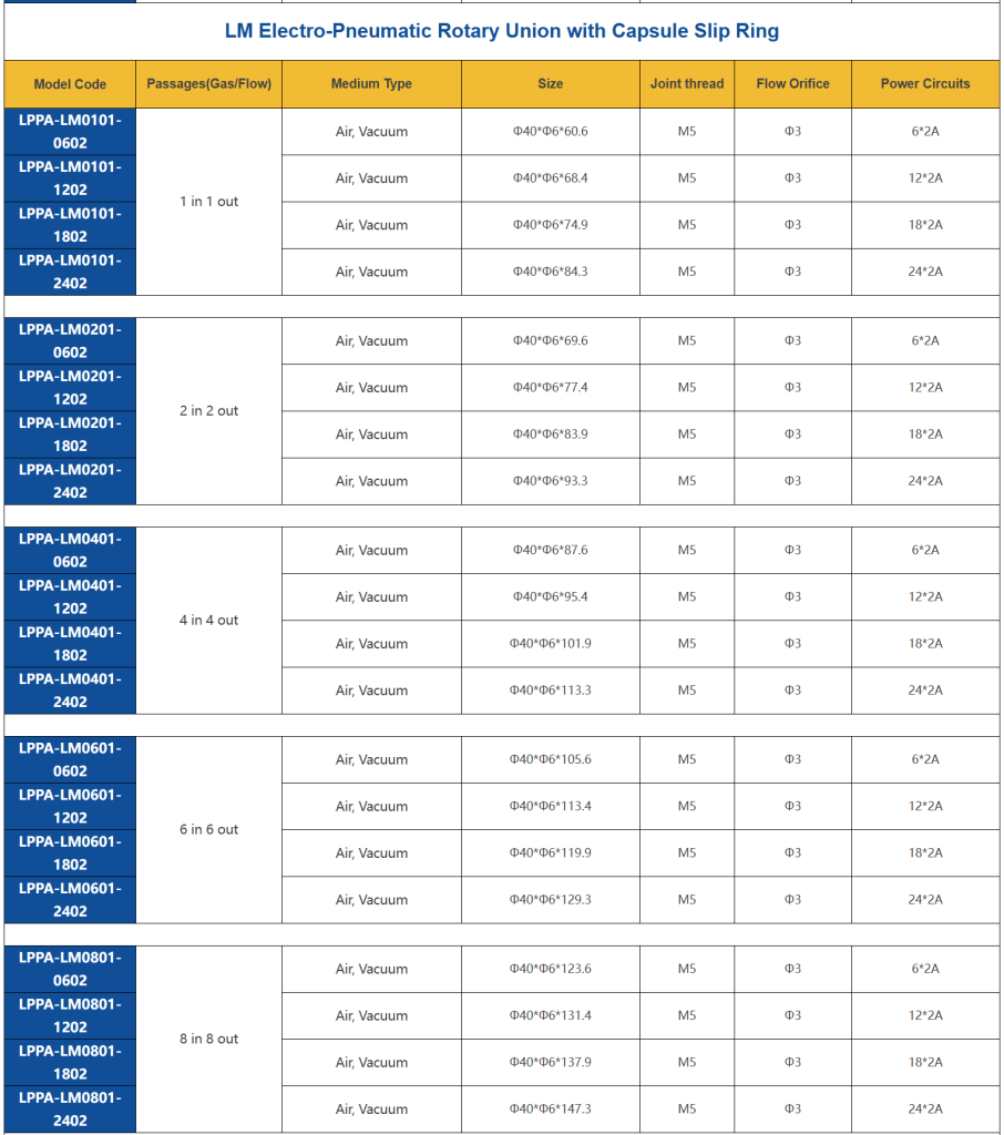 Featuring a compact capsule slip ring structure, the LM series adopts M5 threaded pneumatic ports with a radial air inlet and outlet design, ensuring stable performance in space-limited rotating systems. The product offers 1–24 pneumatic passages and supports flexible integration of electrical channels, making it ideal for applications requiring synchronized transmission of air, power, and signals.